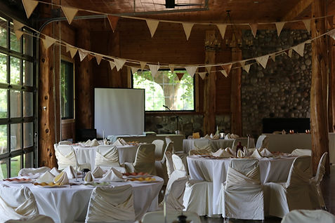 The spacious venue features soaring ceilings, exposed beams, and two striking stone fireplaces that add warmth and character to the space. Two glass garage doors open wide to reveal the views of the Fanshawe Lake, seamlessly blending indoor and outdoor elements and creating a one-of-a-kind setting and an unforgettable atmosphere for your wedding!